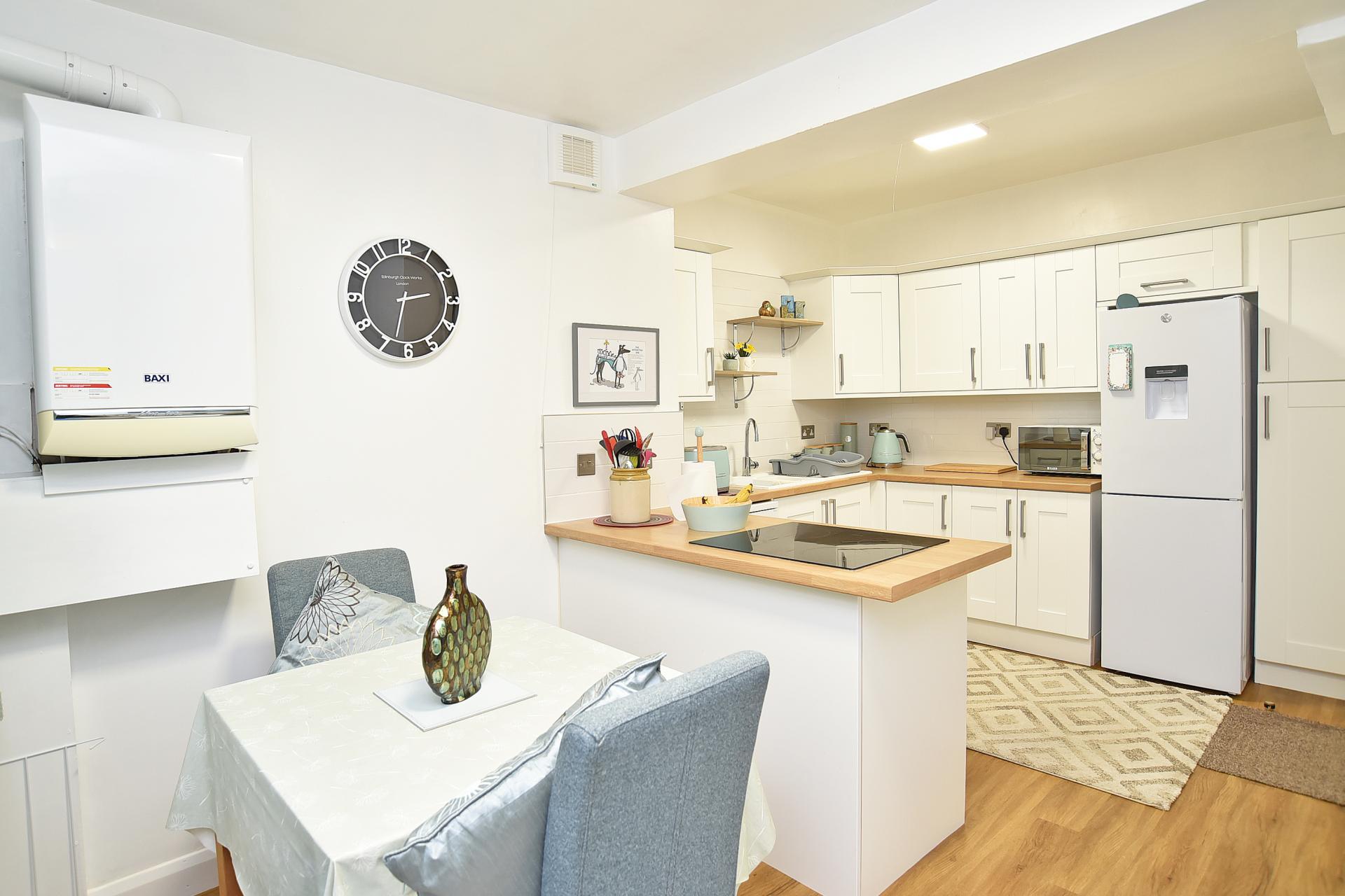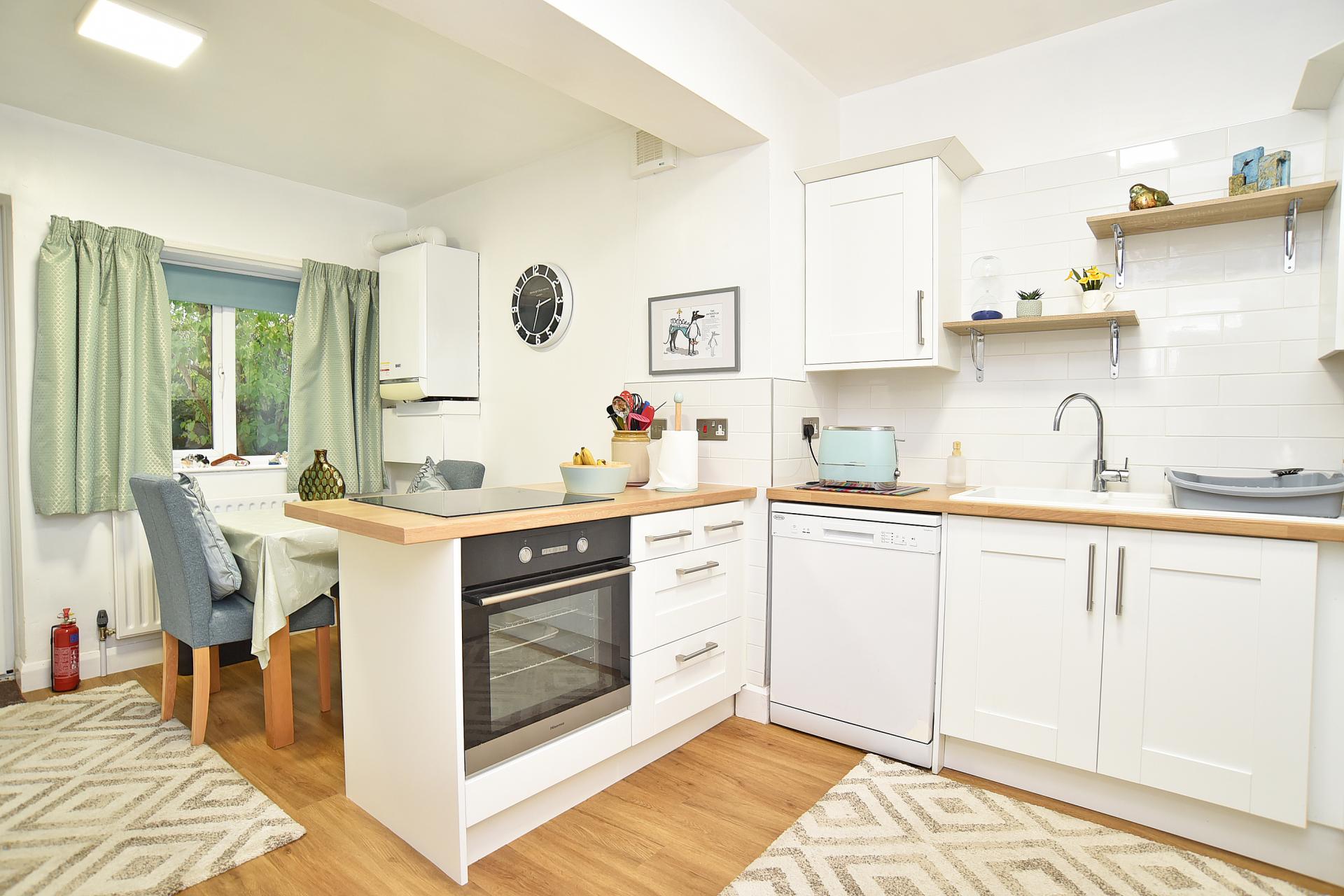 Fitted with a range of units including electric hob, integrated oven and space for appliances. Space for dining table and door leading to the garden.