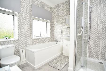 A modern white suite comprising WC, washbasin set within a vanity unit, shower and bath. Heated towel rail.