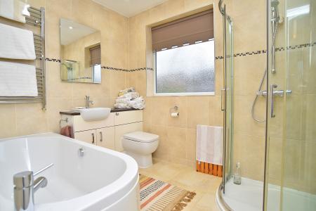 Shower enclosure, Bath, Vanity unit with inset low flush WC and wash basin. Heated chrome ladder towel radiator. Wall mounted mirror. Window to rear elevation.