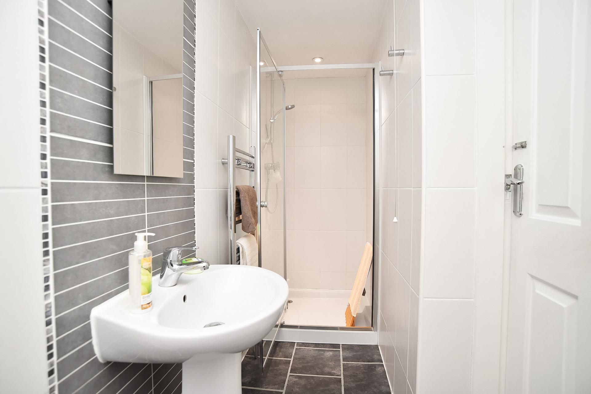 Fully tiled With Walk in shower, Low flush WC, Wash basin, Heated chrome towel radiator. Window to Front elevation