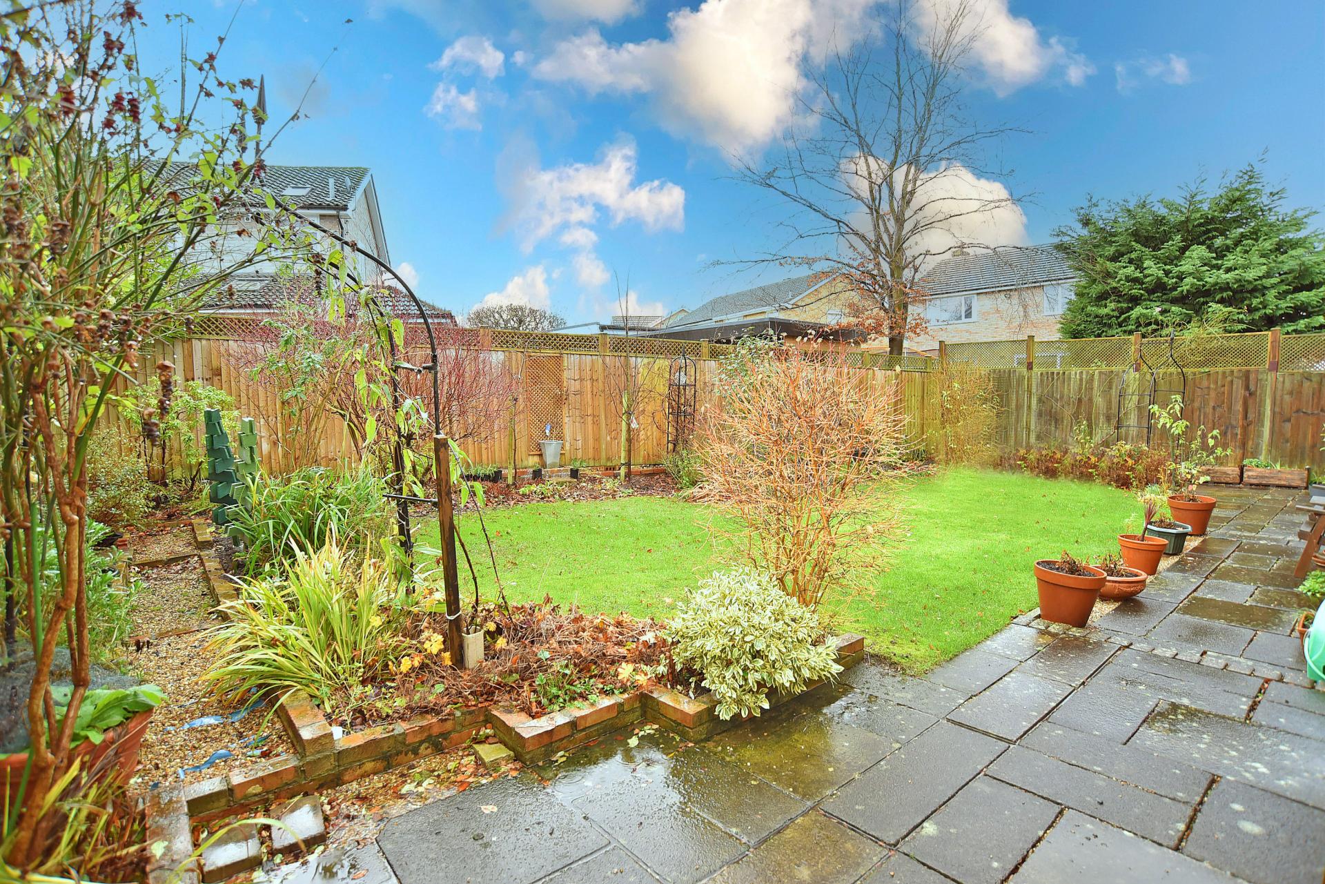 Outside, the driveway to the front provides ample off-street parking and leads to the garage. The front garden features a shaped lawn, while a side pathway gives access to the enclosed rear garden, which includes a shaped lawn, paved seating area, and fenced boundaries.