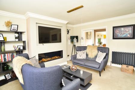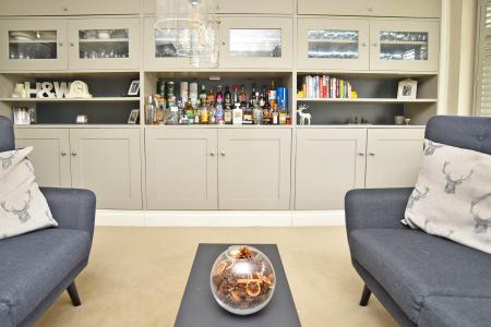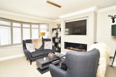 Living room with feature living flame fire, bay window and bespoke cabinets and shelves.