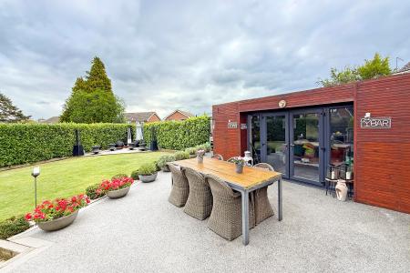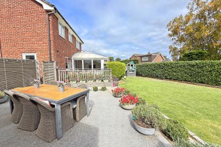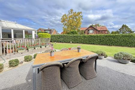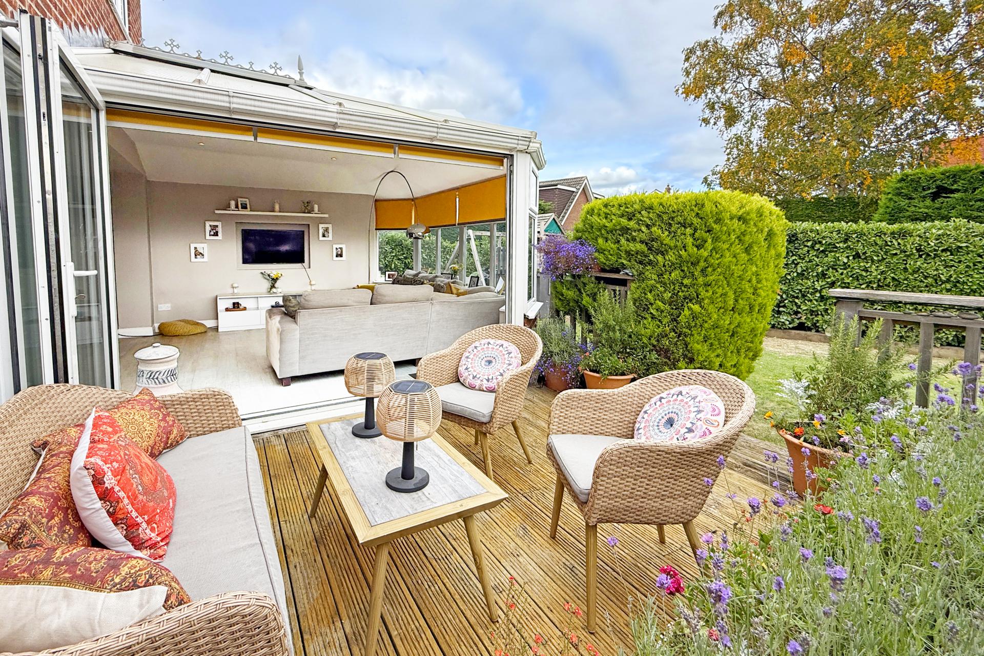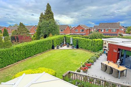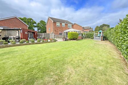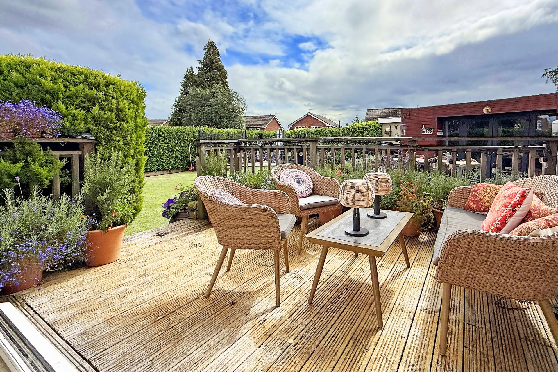 Stunning rear garden with several seating areas, shaped lawned garden and established borders.