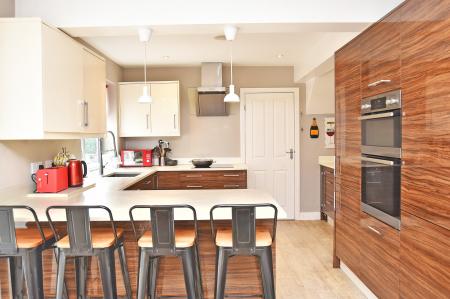The kitchen features a range of wall and base units, integrated appliances and breakfast bar.