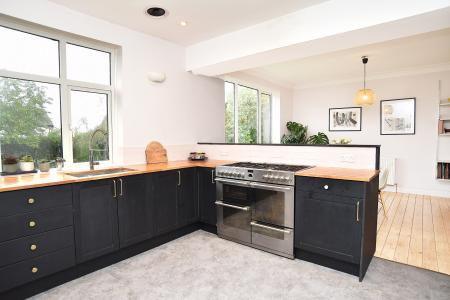 A generous open-plan kitchen and dining area with windows overlooking the garden. The kitchen comprises a range of fitted units with oak worktops and a range cooker. Large pantry cupboard.