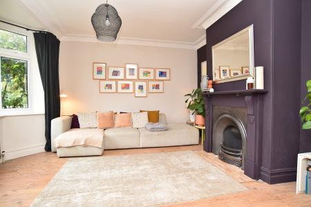 A large reception room with bay window to the front and an attractive fireplace with open fire.