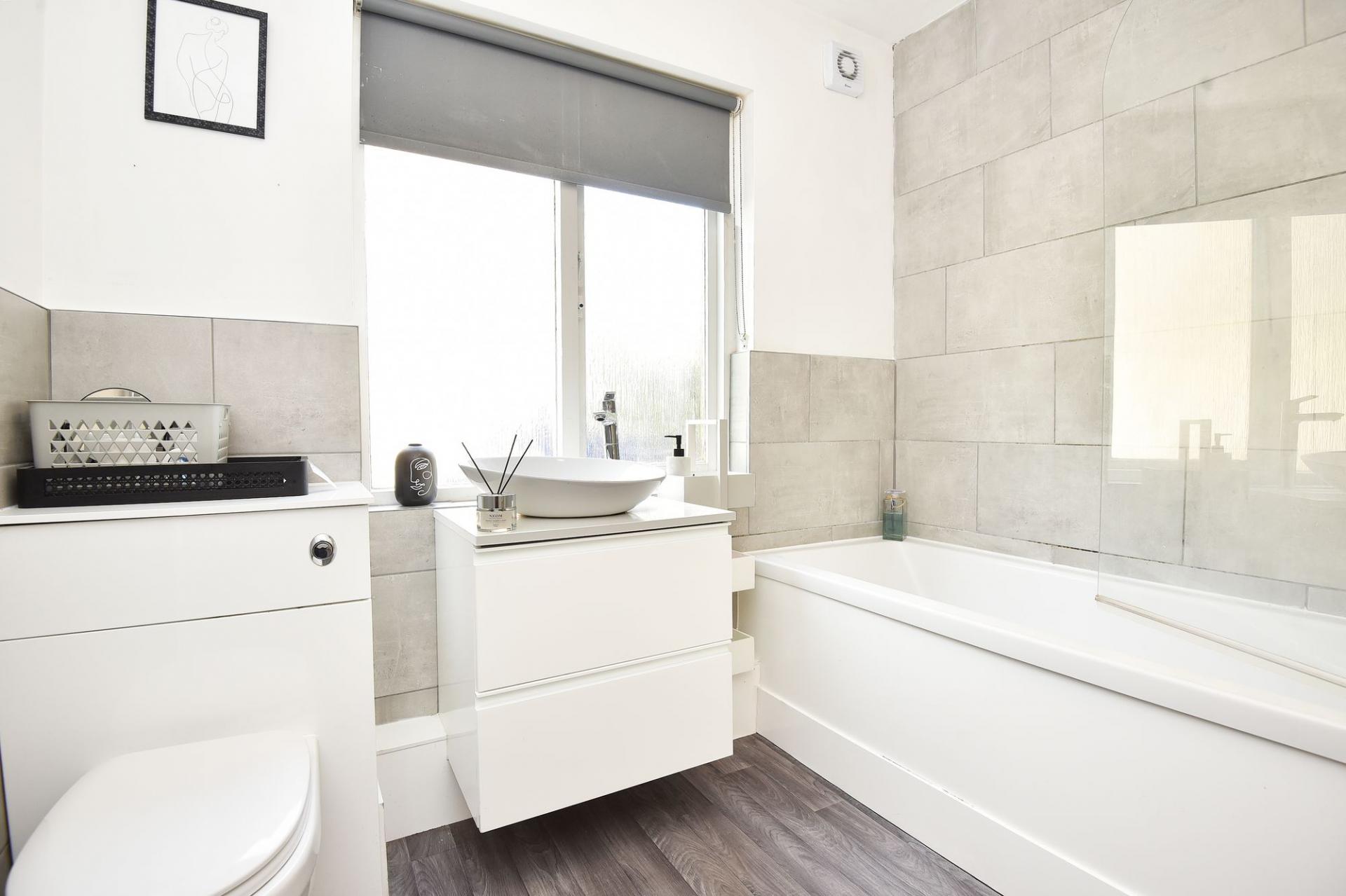 A white modern suite comprising WC, washbasin set atop a vanity unit, bath with shower above. Heated towel rail.