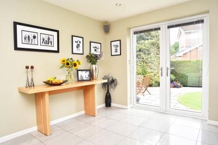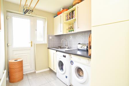 With a range of fitted wall and base units with five-ring gas hob with extractor above. A variety of integrated appliances including a fridge, dishwasher, double oven and microwave. There is a breakfast bar and window and double patio doors overlooking the rear garden. A door leads through to a utility area with sink and space and plumbing for washing machine and tumble dryer, integrated freezer and access to the garage. External door to rear.