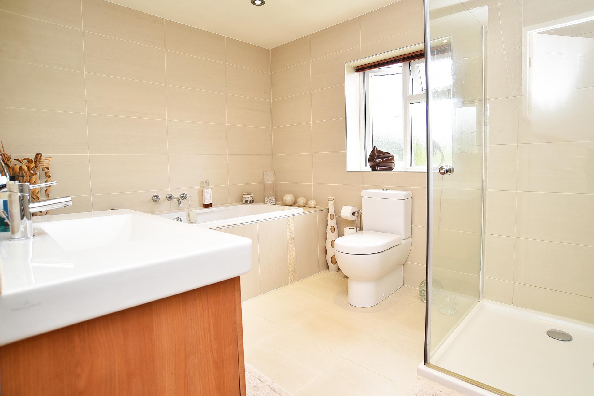 With WC, washbasin, bath, separate walk-in shower and heated towel rail. Window to the rear.