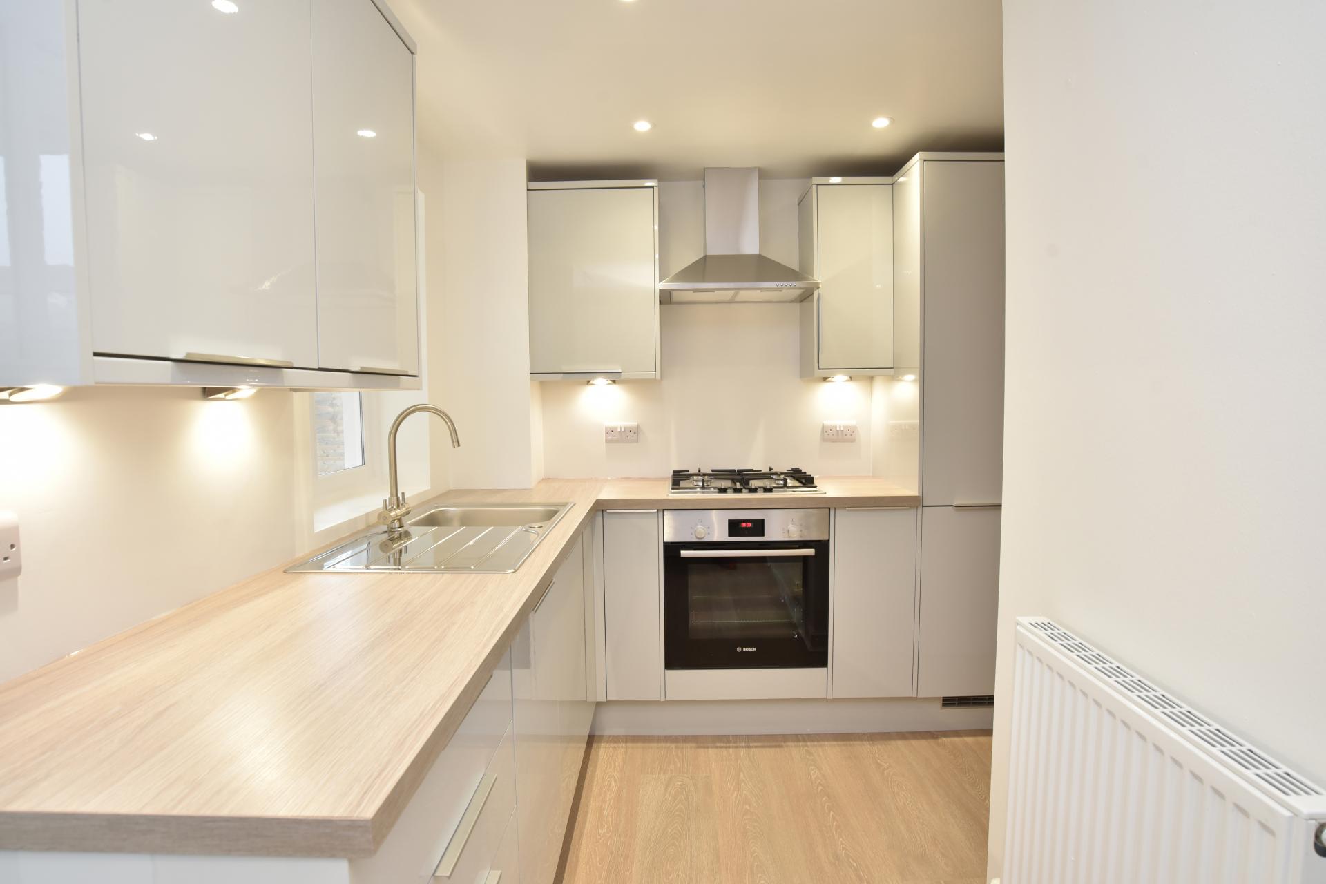 A modern fitted kitchen with gas hob and electric oven. Integrated dishwasher and fridge/freezer and freestanding washing machine and tumble dryer.