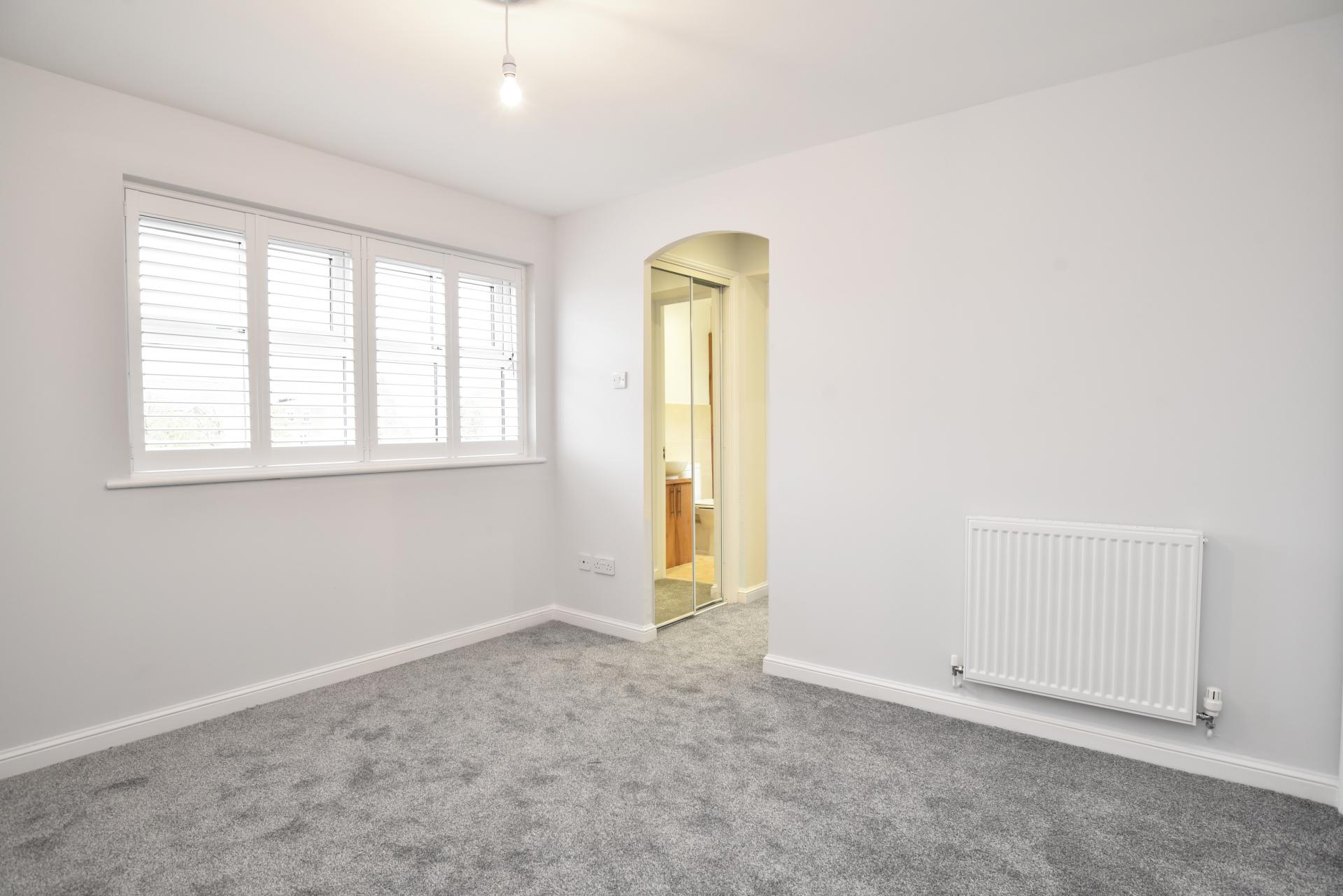 A double bedroom with fitted wardrobes and window with fitted shutters.