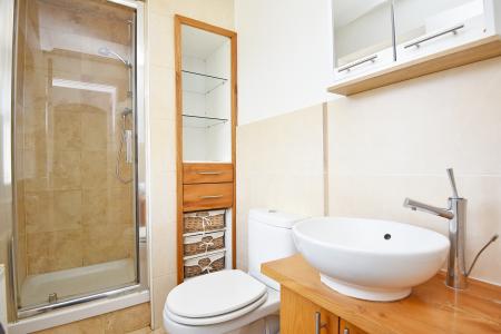 A modern white suite with WC, basin and shower. Tiled walls and floor.