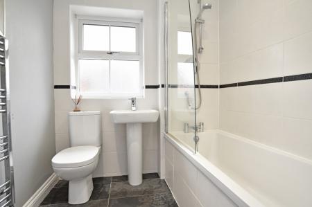 A modern white suite with WC, washbasin, and bath with shower above. Tiled walls and floor and heated towel rail.