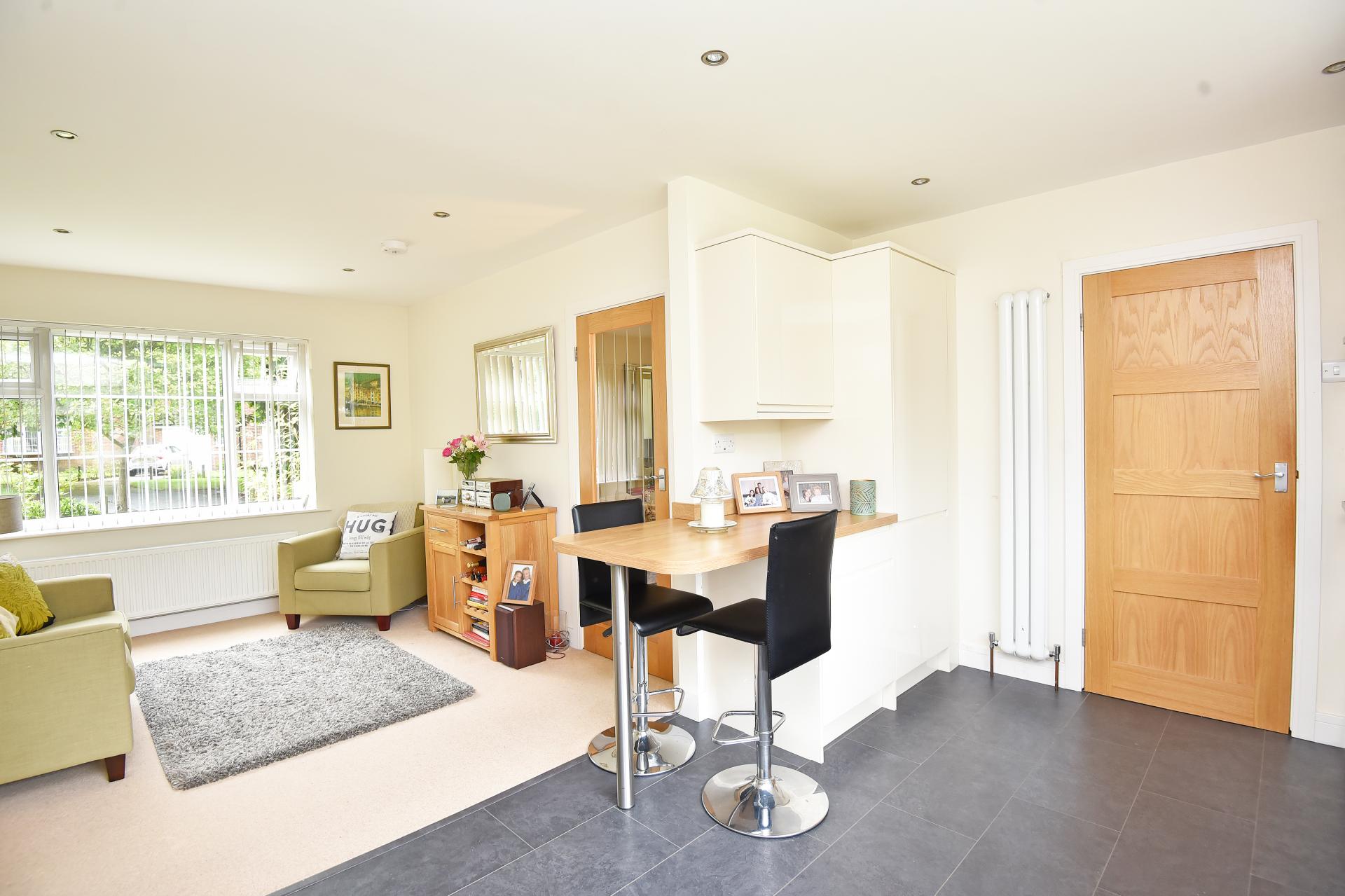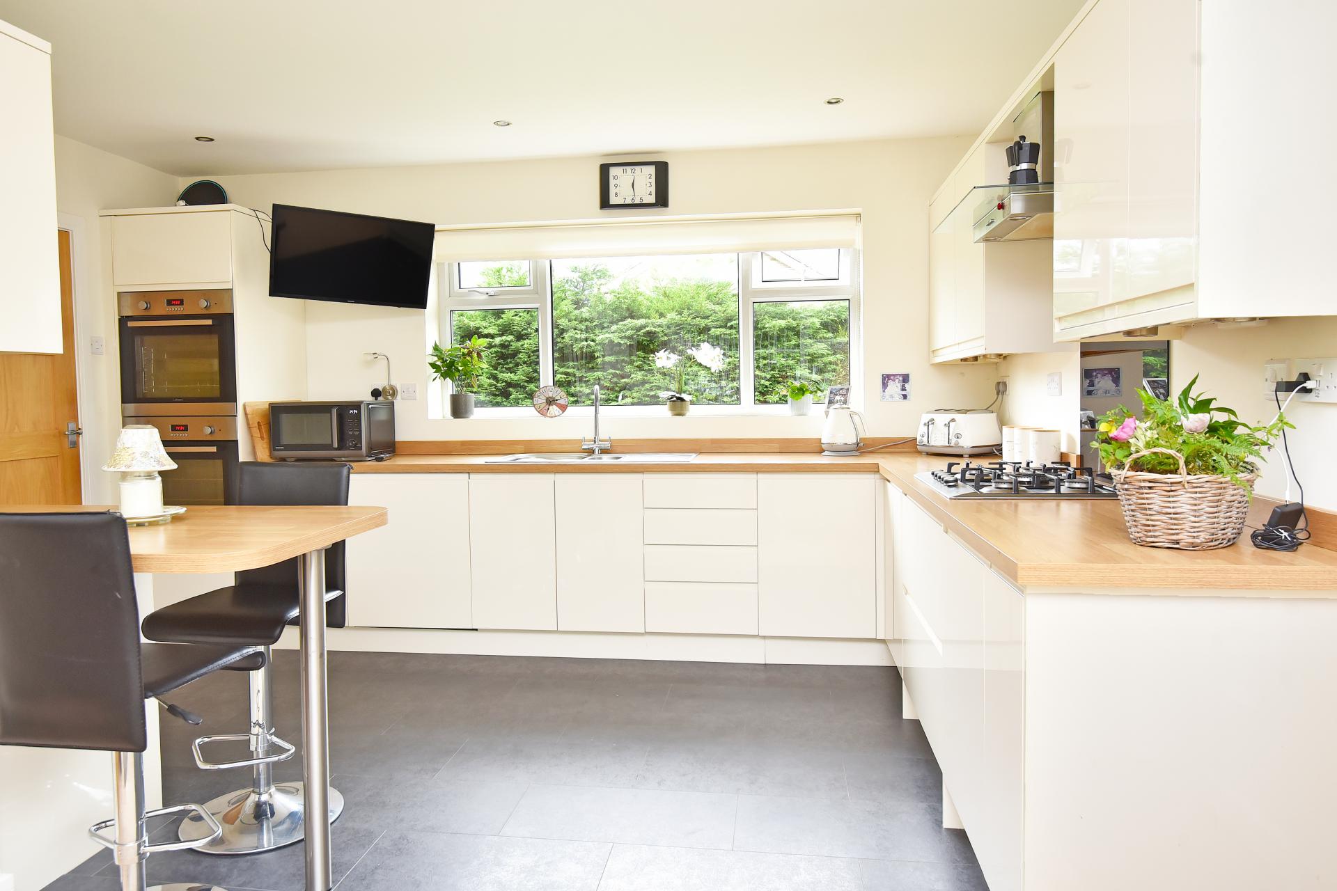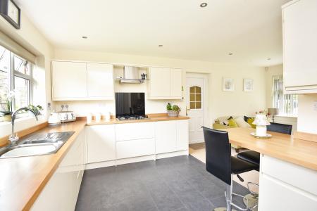 A stunning open-plan kitchen and living space with room for sitting or dining area. The kitchen comprises a range of stylish modern units with worktop and breakfast bar. Gas hob, integrated double oven and integrated appliances.