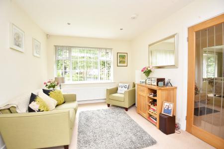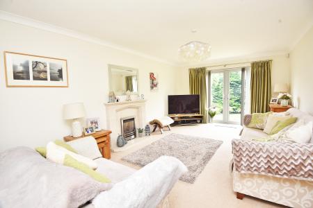 A spacious reception room with feature fireplace and living-flame gas fire and glazed patio doors leading to the garden.