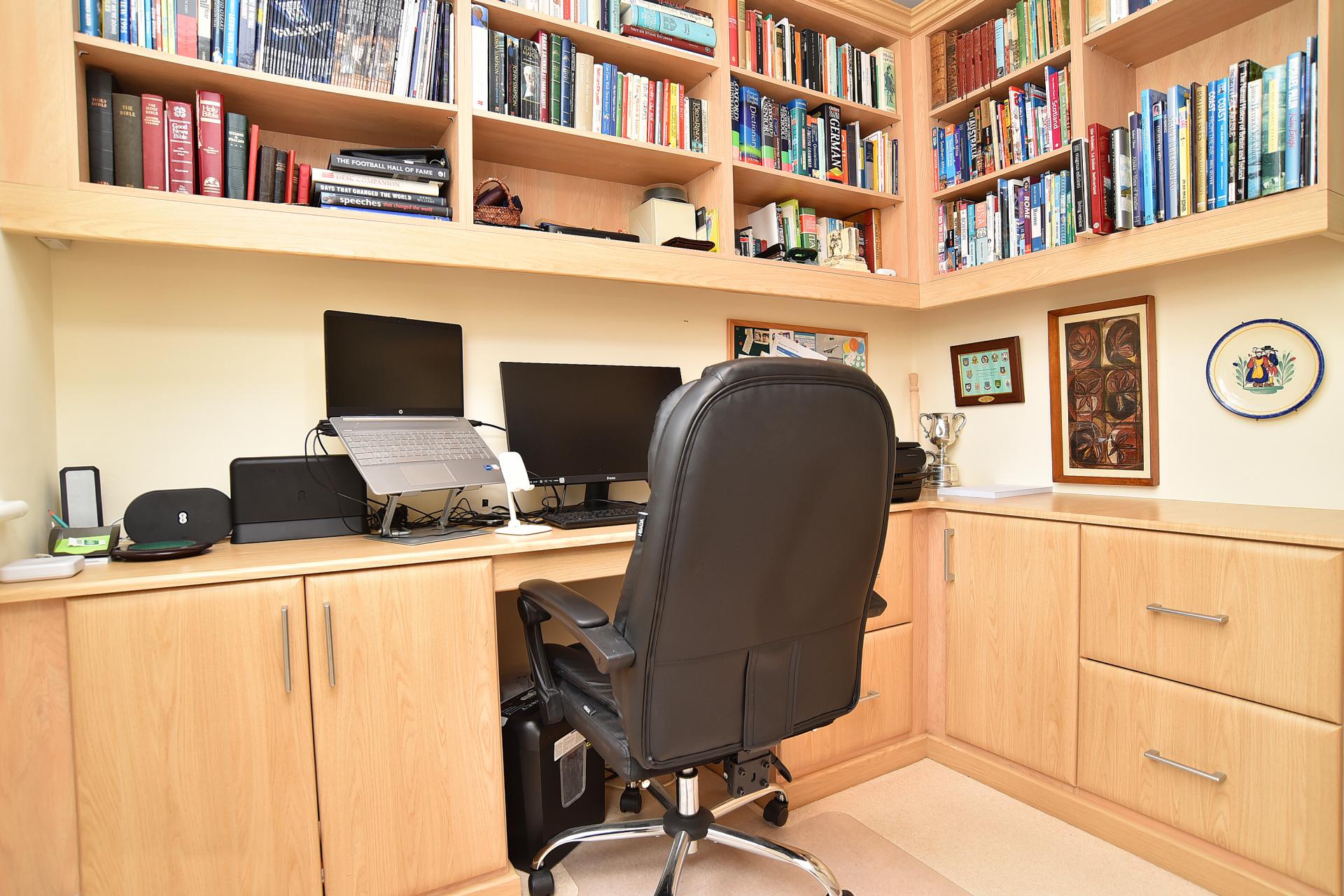 Providing a useful workspace with fitted desk, drawers and shelving.