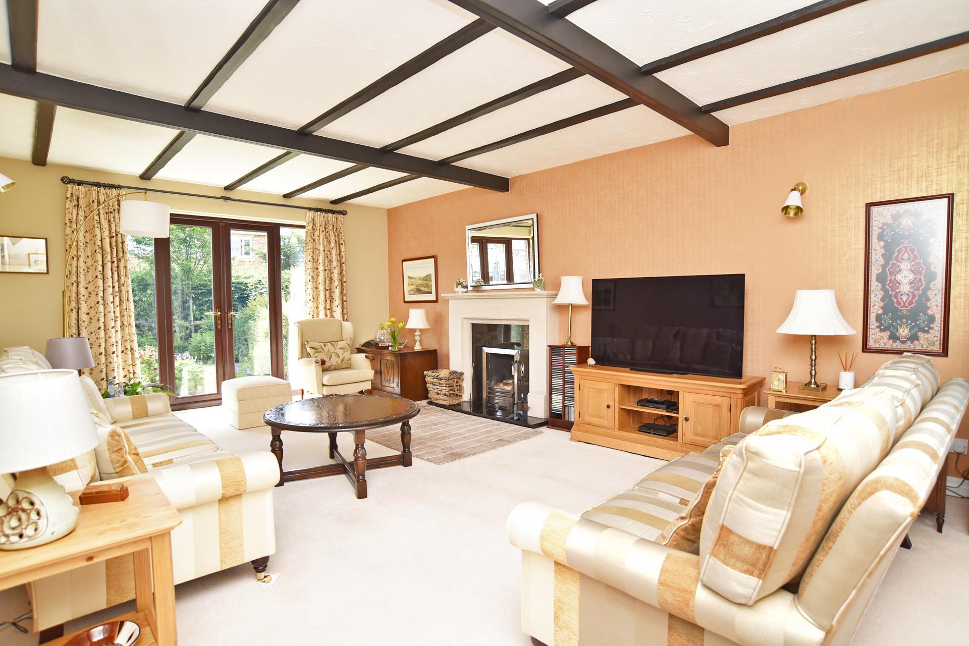 A large reception room with attractive fireplace with open fire. Glazed doors lead to the garden.