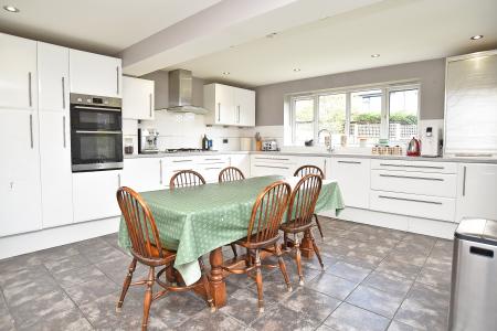 A generous kitchen fitted with a range of modern wall and base units with integrated appliances and breakfast area. Door to garden and access to utility room.
