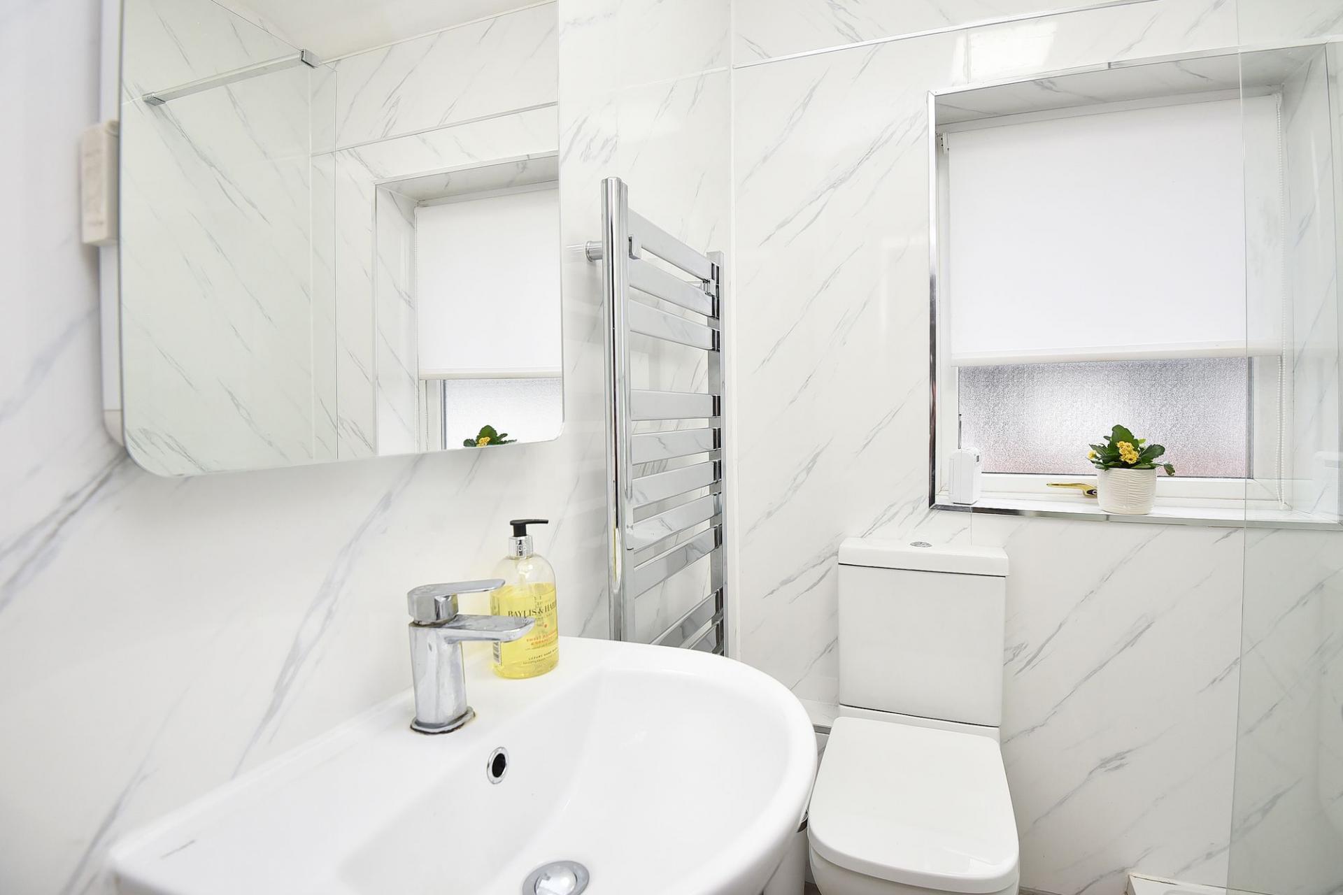 Heated towel rail. Washbasin, WC, and walk-in shower. Double-glazed window to the side.