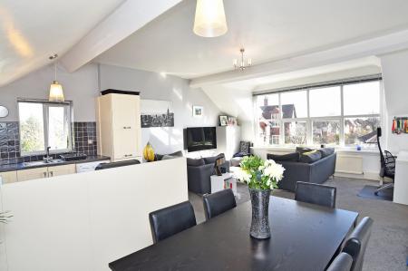 A stunning open plan living space with sitting and dining areas, large window to side and further window to rear. The kitchen comprises a range of modern wall and base units with electric hob, oven, integrated fridge and freezer and plumbing for a washing machine.