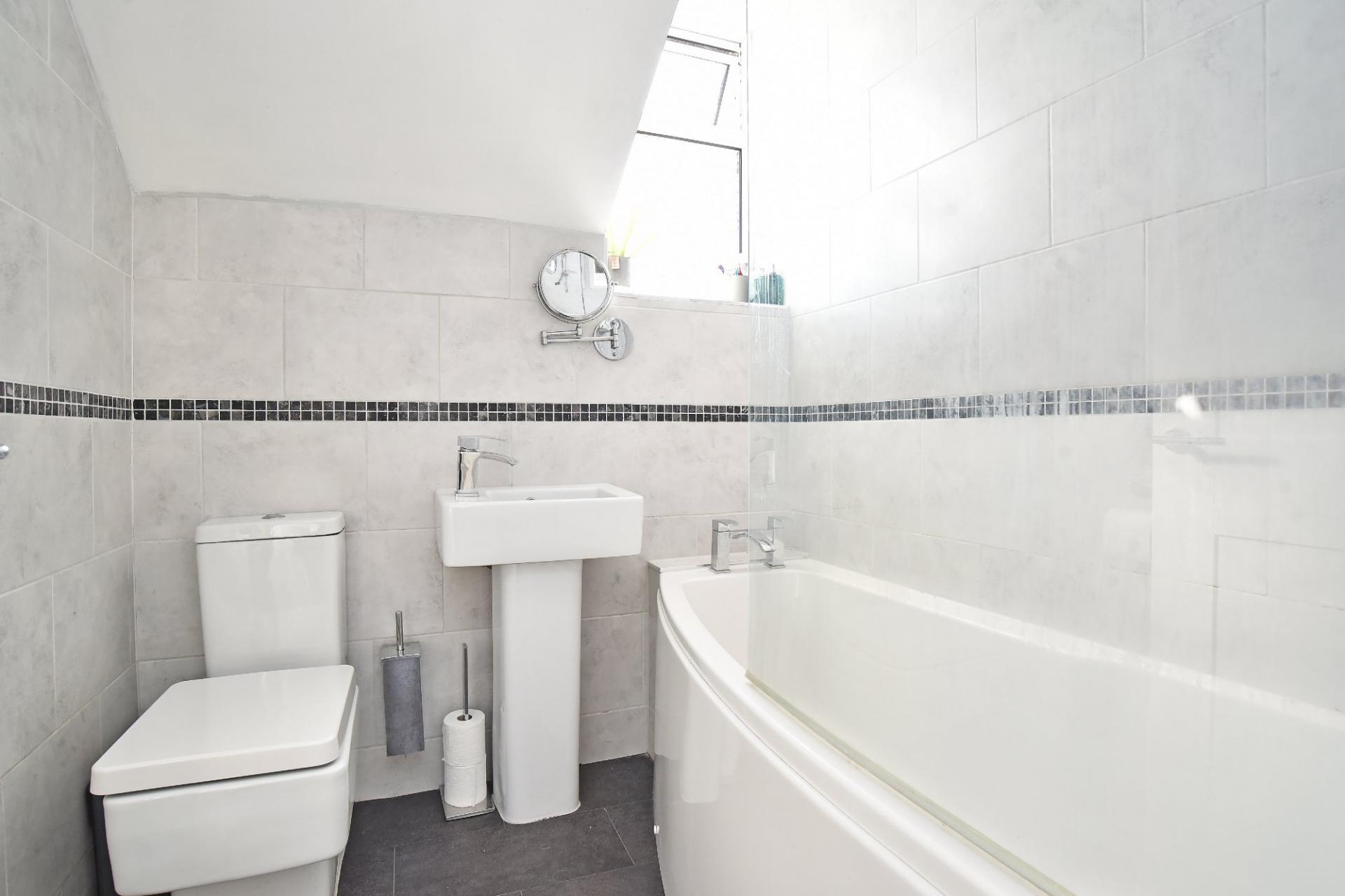 A modern white suite with WC, basin and bath with shower above. Window to side and heated towel rail.