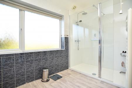 Bathroom incorporating walk in shower, wash basin and heated towel rail. Separate WC.