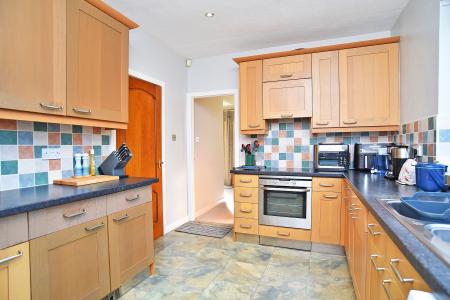 Kitchen with excellent range of wall and base units, built in oven and hob, space for fridge/freezer and plumbing for washing machine. Integrated dishwasher.