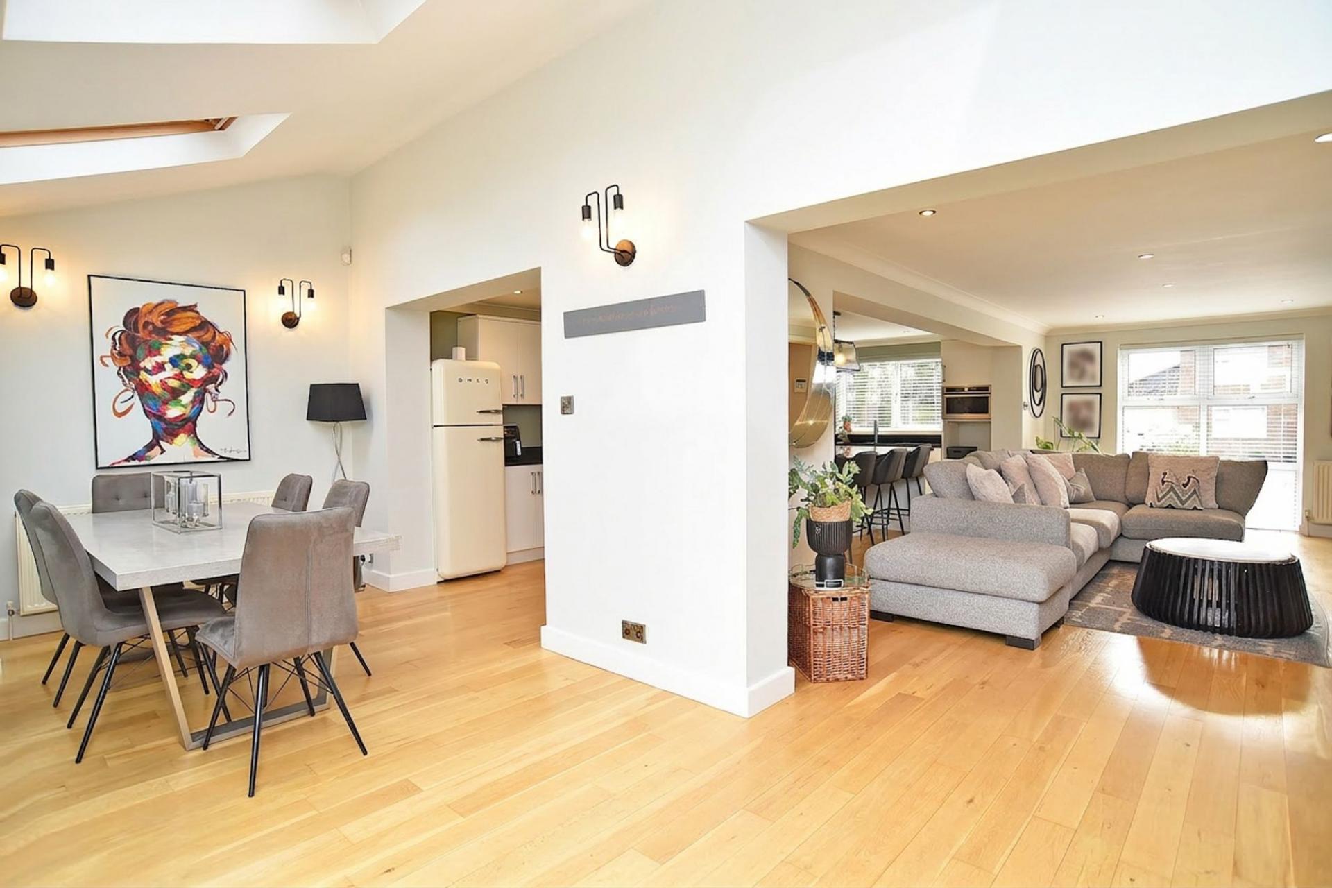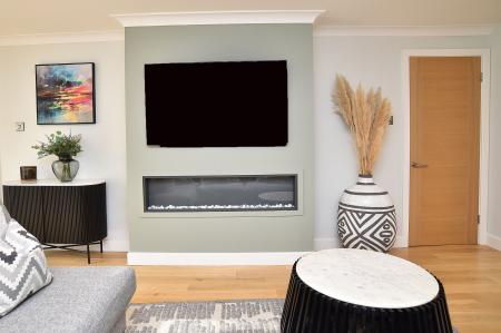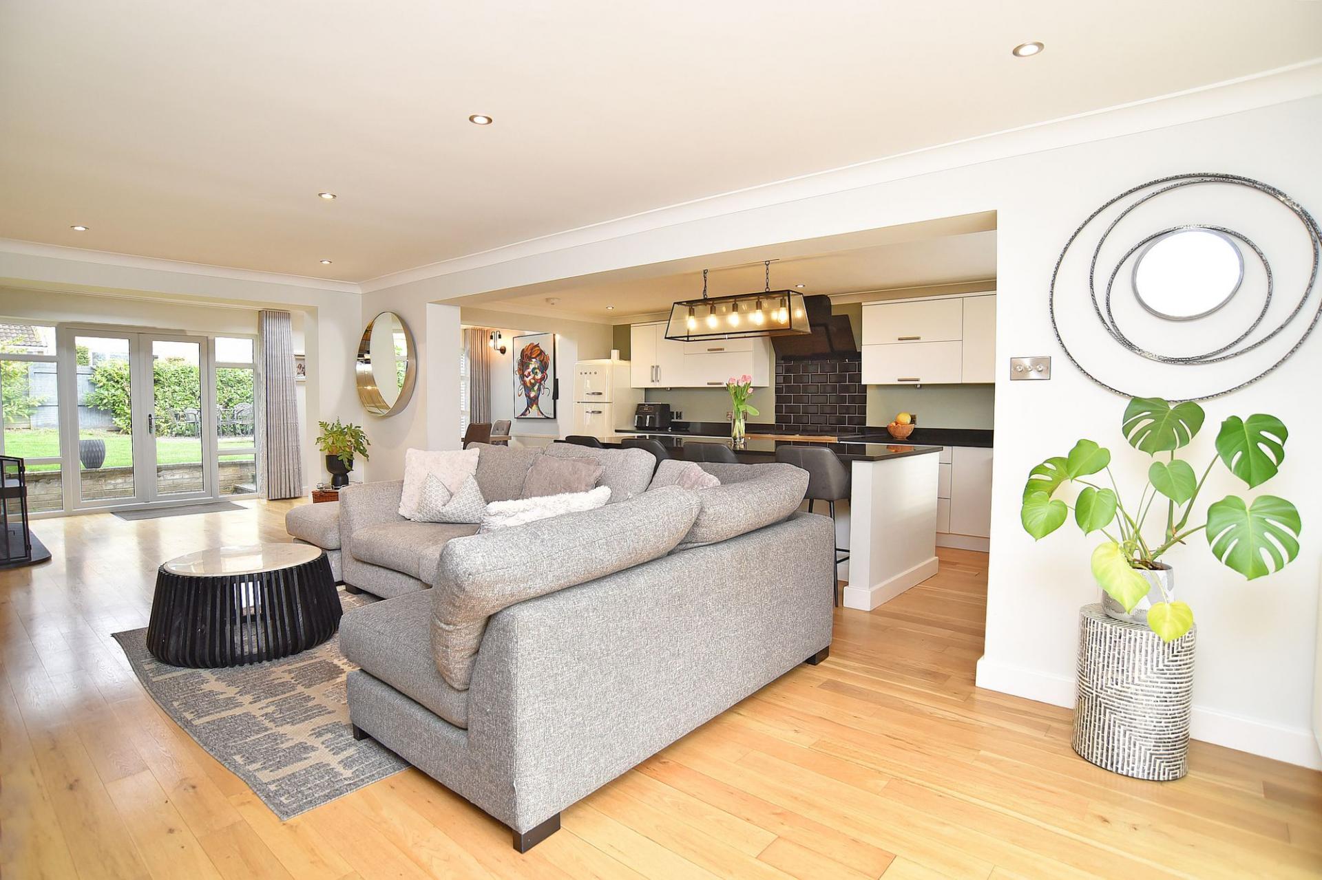 A stunning open-plan living space forms the heart of the home, providing generous areas for relaxing, dining and entertaining. The sitting area features a contemporary inset fireplace with media wall, while glazed doors allow plenty of natural light and provide views and access to the rear garden.
