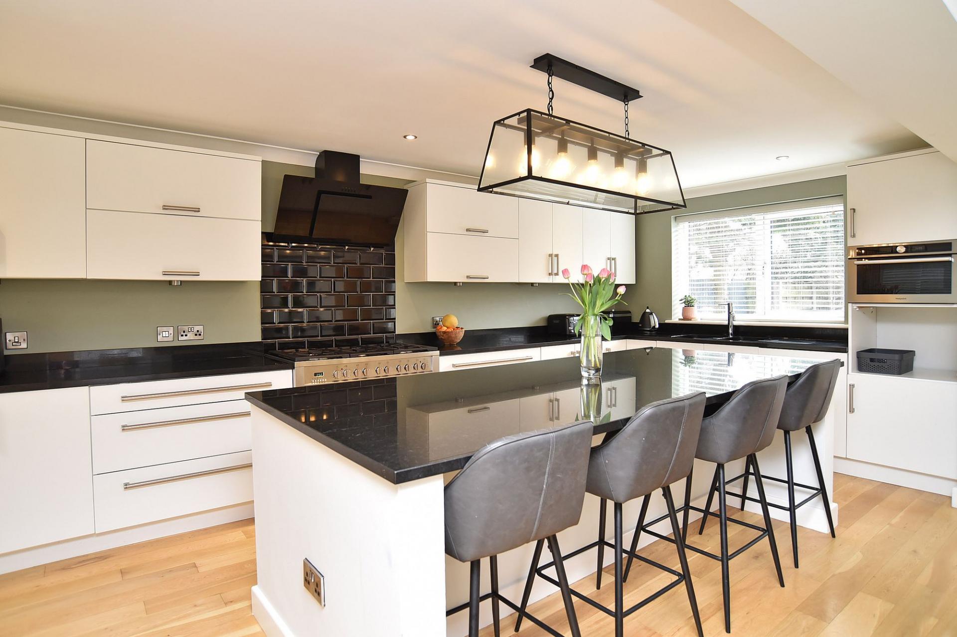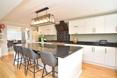 The stylish kitchen is fitted with a range of modern wall and base units with contrasting granite worktops and a large central island incorporating a breakfast bar. There is space for a range cooker with extractor above, integrated dishwasher and ample storage throughout.