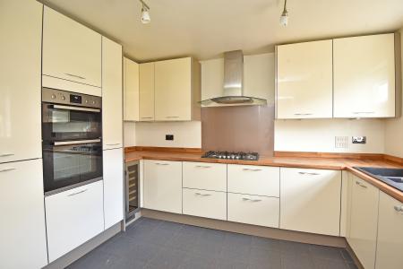 A modern fitted kitchen with a range of stylish wall and base units with gas hob, double oven, integrated fridge / freezer, drinks fridge, integrated dishwasher, washing machine and boiling- water tap.