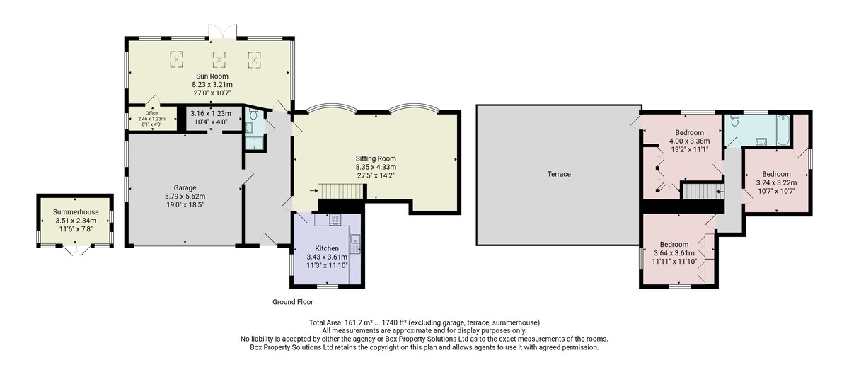 There are three good-sized double bedrooms on the first floor, two of which have fitted wardrobes. There is access from the main bedroom via a door leading to a large sun terrace.