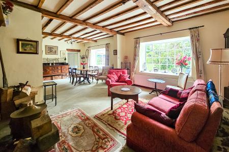 A large reception room with space for sitting and dining areas, with bay windows overlooking the garden. Attractive brick fireplace with open fire.