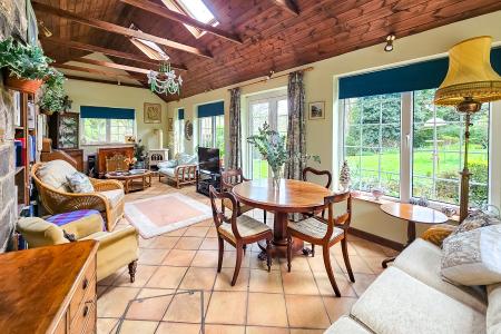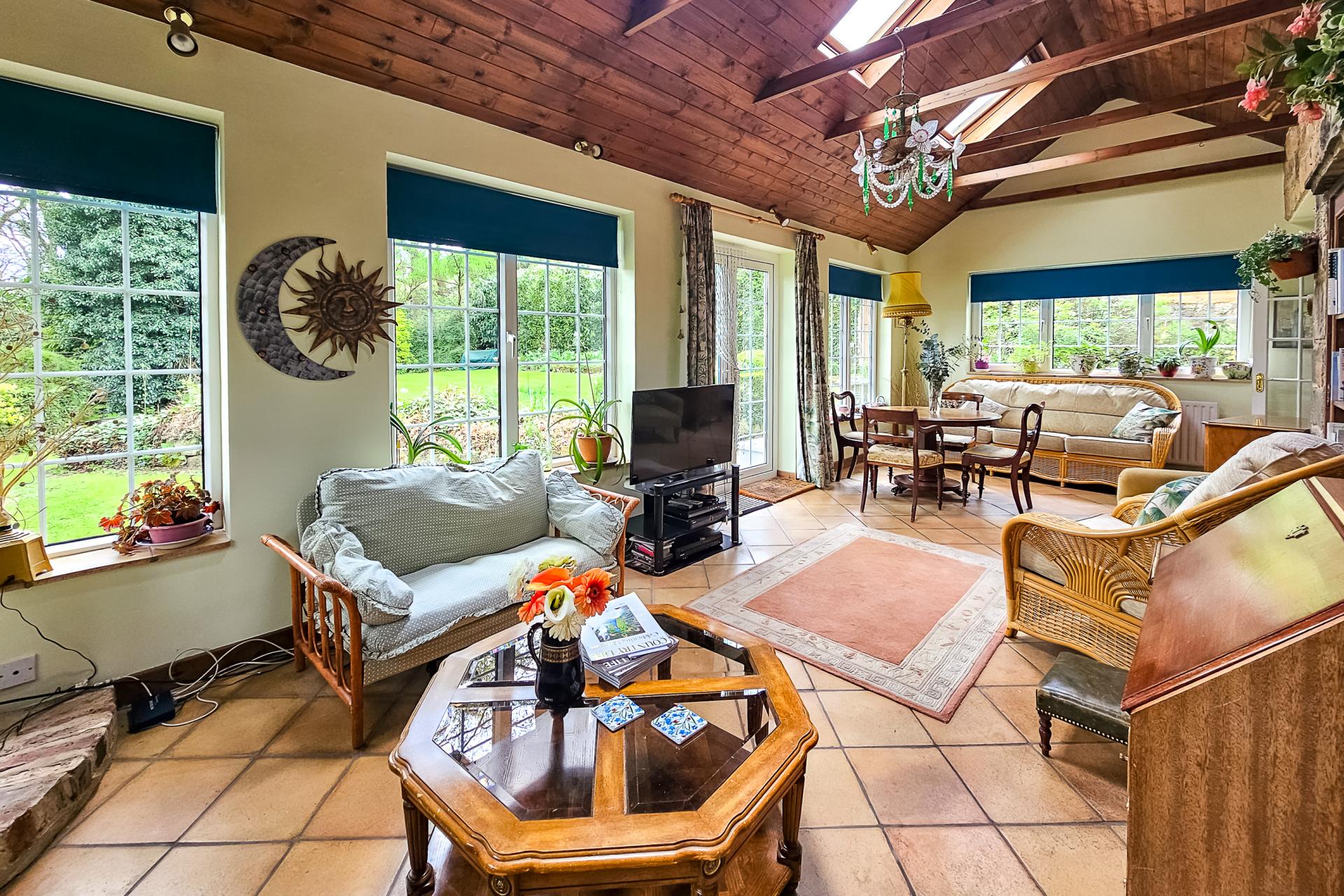 A superb additional reception room with vaulted ceiling and skylight windows and double-glazed windows and doors leading to the garden. Log-effect gas stove.