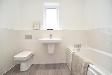 A modern white suite comprising WC, basin, bath and shower. Heated towel rail.