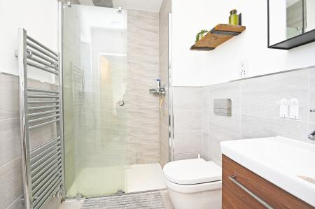 A modern white suite comprising WC, basin set within a vanity unit and shower. Heated towel rail.