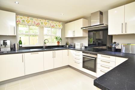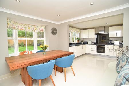 A stylish open-plan kitchen and dining area with tiled flooring and bay window overlooking the garden. The kitchen comprises a range of contemporary units with induction hob, integrated oven, microwave, dishwasher and fridge / freezer.