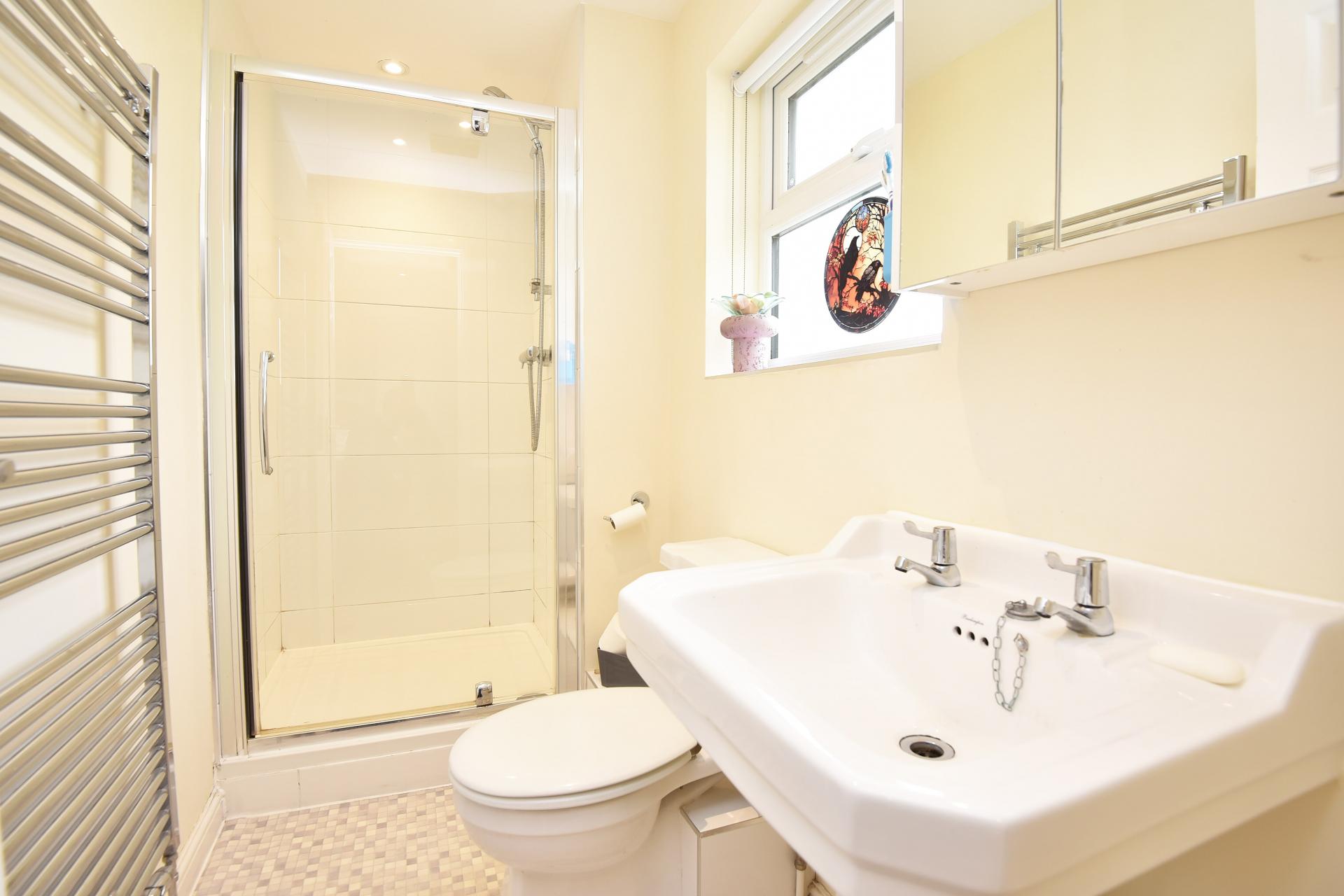 A white suite comprising WC, washbasin and shower. Heated towel rail.