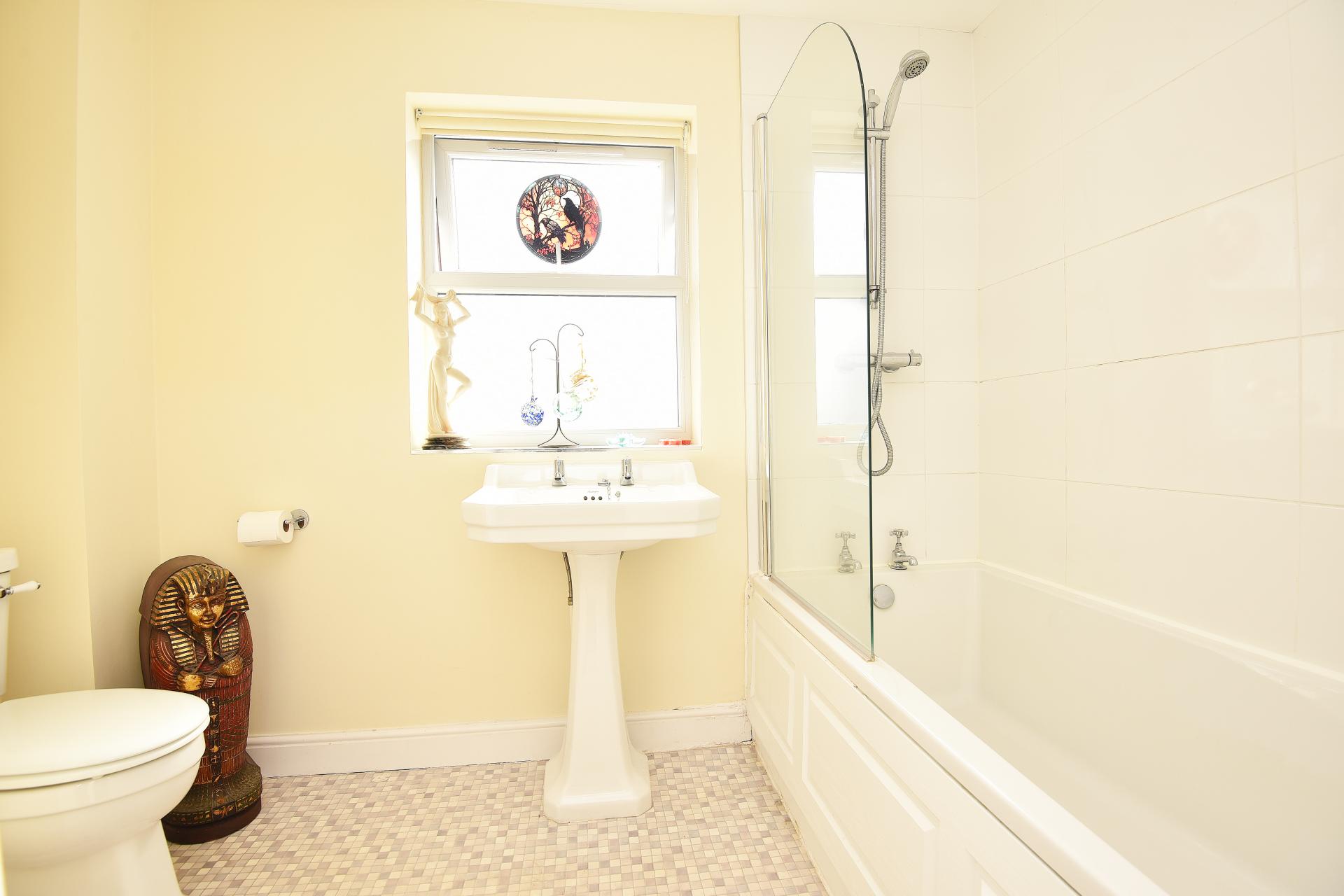 A white suite comprising WC, washbasin, and bath with shower above. Heated towel rail.