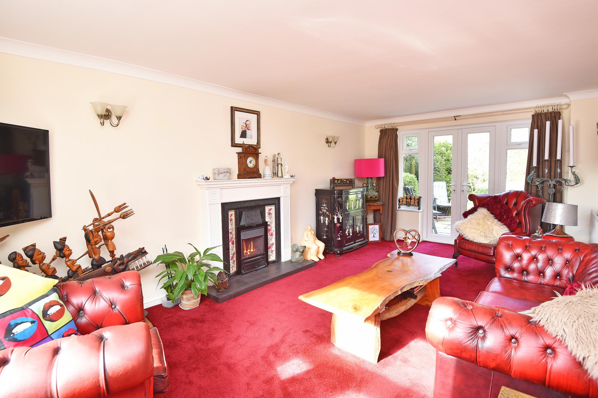 A large reception room with patio doors leading to the garden and attractive fireplace with glass- fronted living flame gas fire.