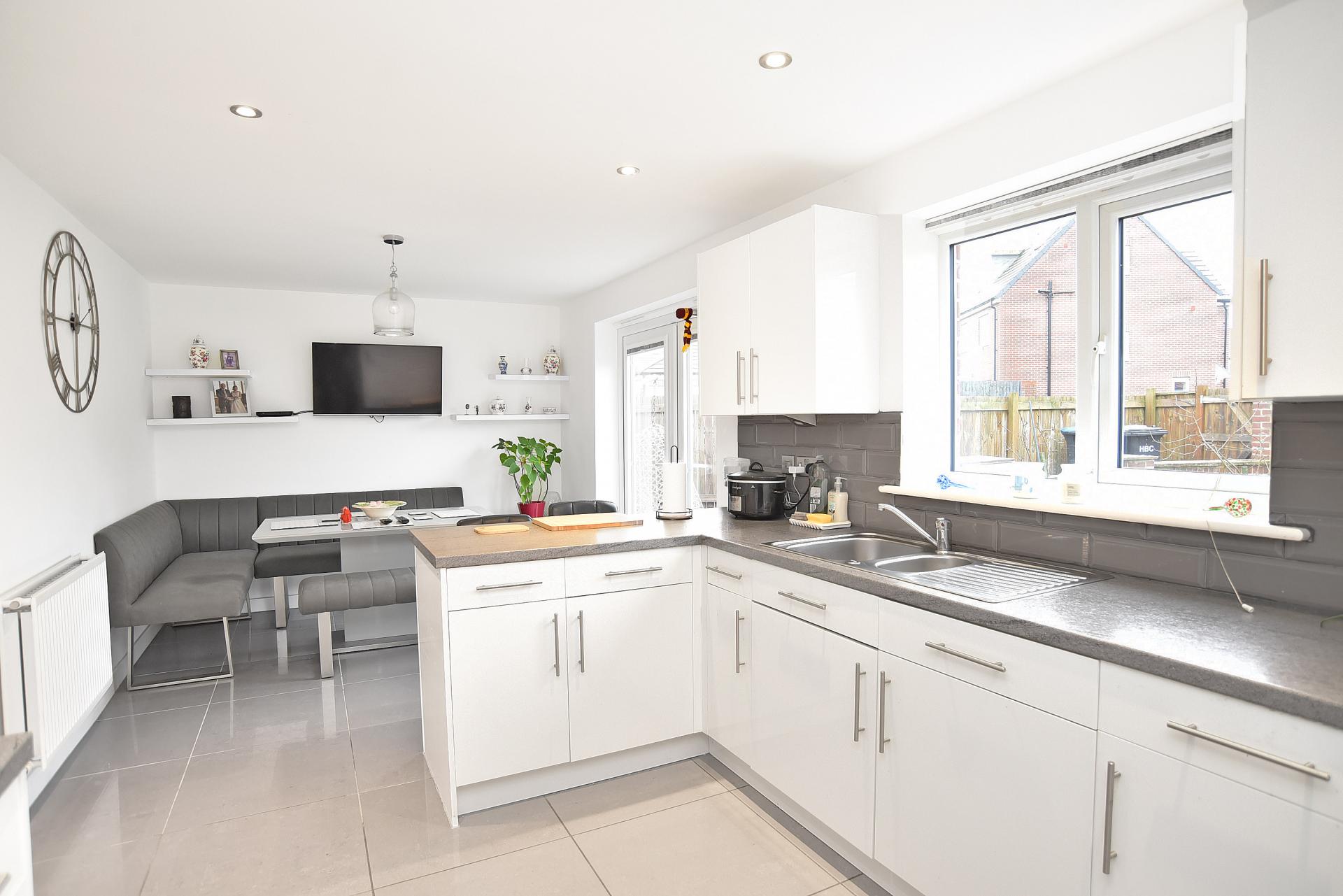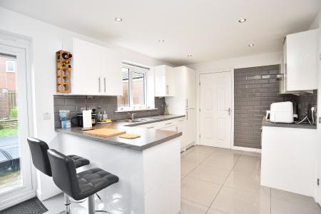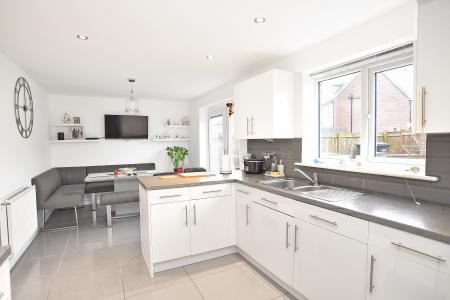 To the rear of the property is a bright and contemporary open-plan kitchen/dining room, forming the heart of the home. The kitchen is fitted with a range of modern units with contrasting work surfaces and provides ample space for dining and everyday family life. Double doors open directly onto the rear garden, creating an excellent connection between indoor and outdoor space. A separate utility room adjoins the kitchen and provides further storage and practicality.