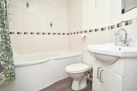 Modern white suite comprising low-flush WC, washbasin set within a vanity unit, and shower bath with shower over. Heated towel rail.