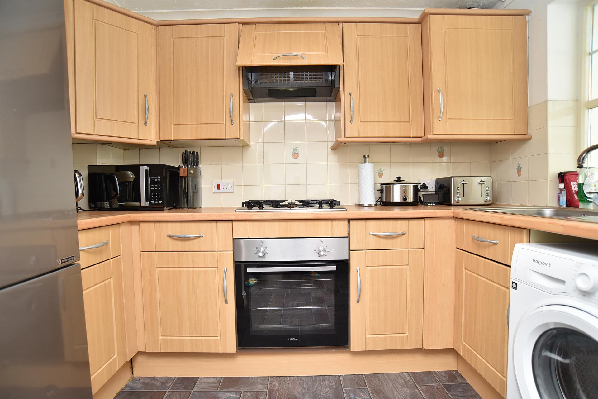 Fitted with a range of wall and base units and work surfaces incorporating a stainless-steel sink and drainer. Four-ring gas hob with extractor hood, integrated electric oven, plumbing for washing machine and space for fridge / freezer. Window to the rear.