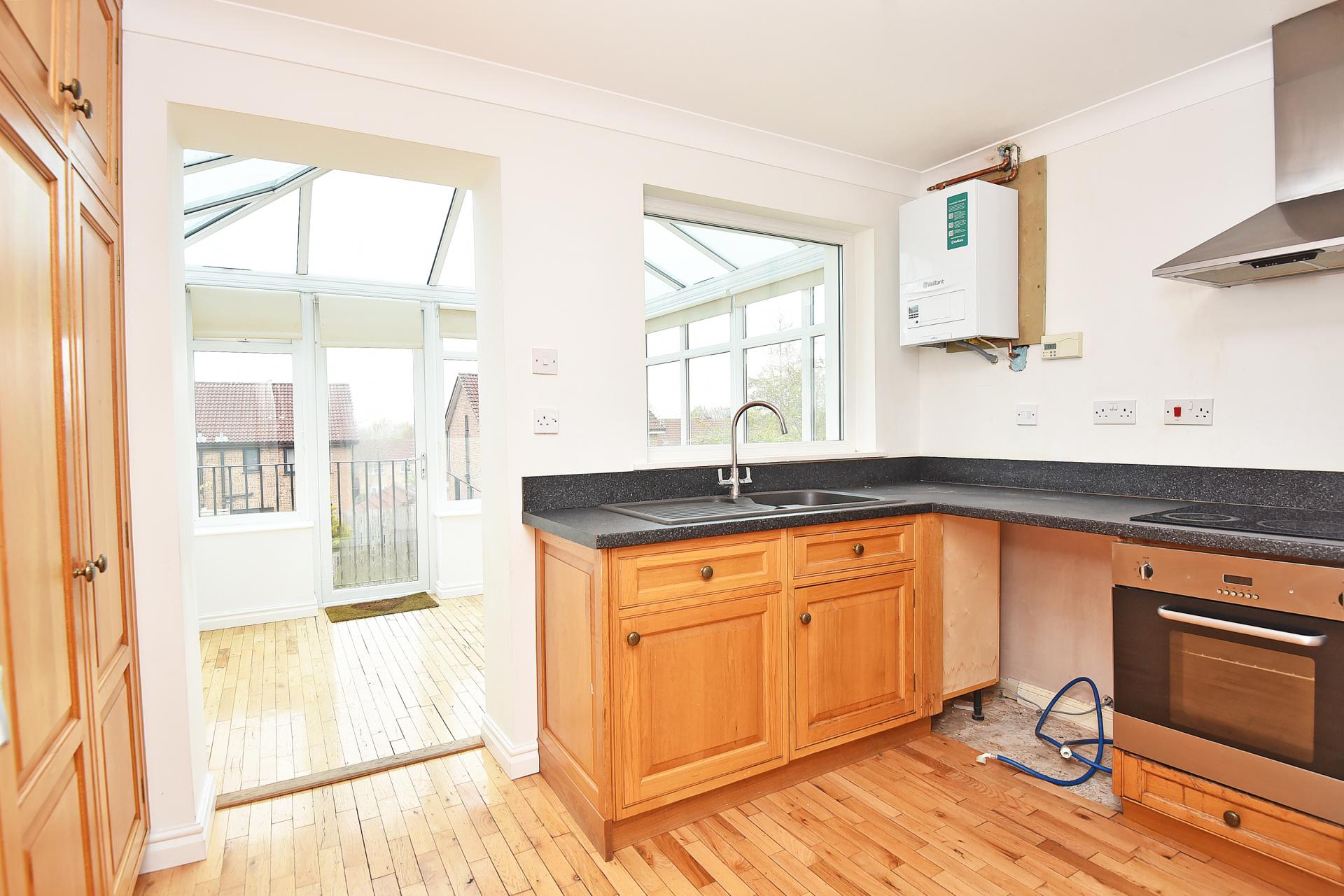 A fitted kitchen with solid oak fittings by Charles Loxley. These fittings comprise a range of full-width, full-height storage cupboards plus base cupboards with working surfaces above with inset single-drainer sink unit. Built-in ceramic hob with oven below. Plumbing for washing machine. Solid oak flooring.