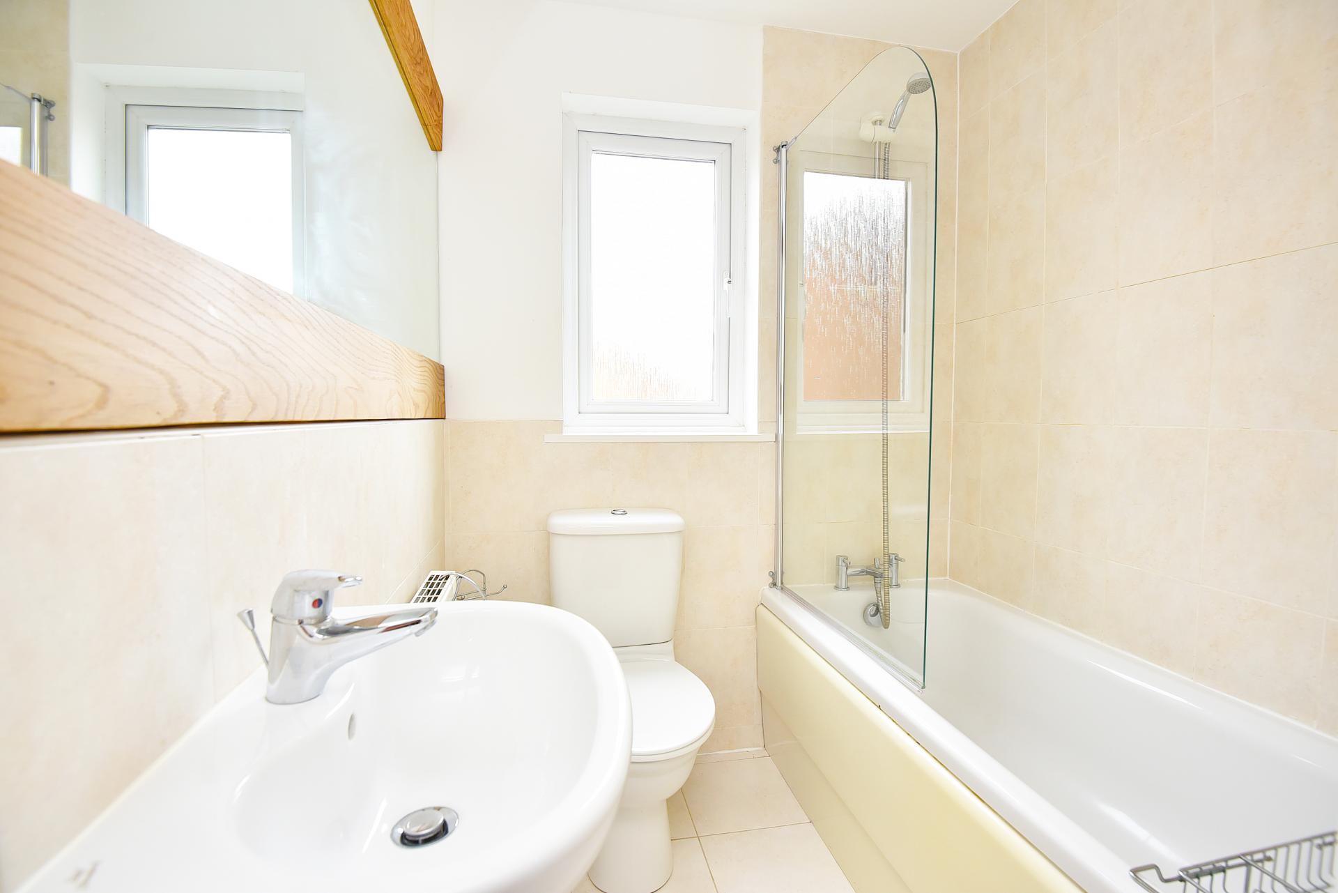 Modern white suite comprising low-flush WC, pedestal washbasin and panelled bath with mixer taps and shower attachment. Fully tiled shower area above bath, half-tiled walls and tiled floor.