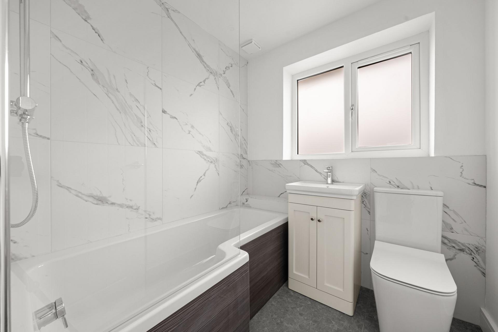The contemporary house bathroom is fitted with a modern white suite comprising a panelled bath with glazed shower screen and shower over, wash hand basin set within a vanity unit, and low-level WC. Stylish marble-effect wall tiling creates a sleek finish, complemented by contrasting flooring and a frosted window providing natural light.