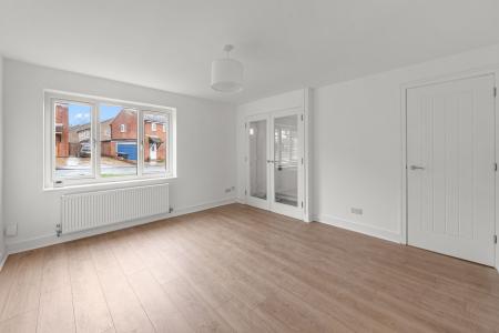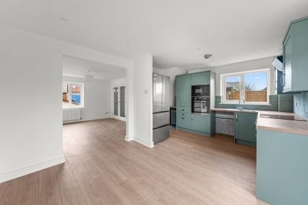 The ground floor comprises a welcoming entrance hall leading to a generous sitting room featuring a large front-facing window allowing excellent natural light. Contemporary glazed double doors open seamlessly into the dining kitchen, creating a superb sense of flow while retaining the option to separate the spaces.