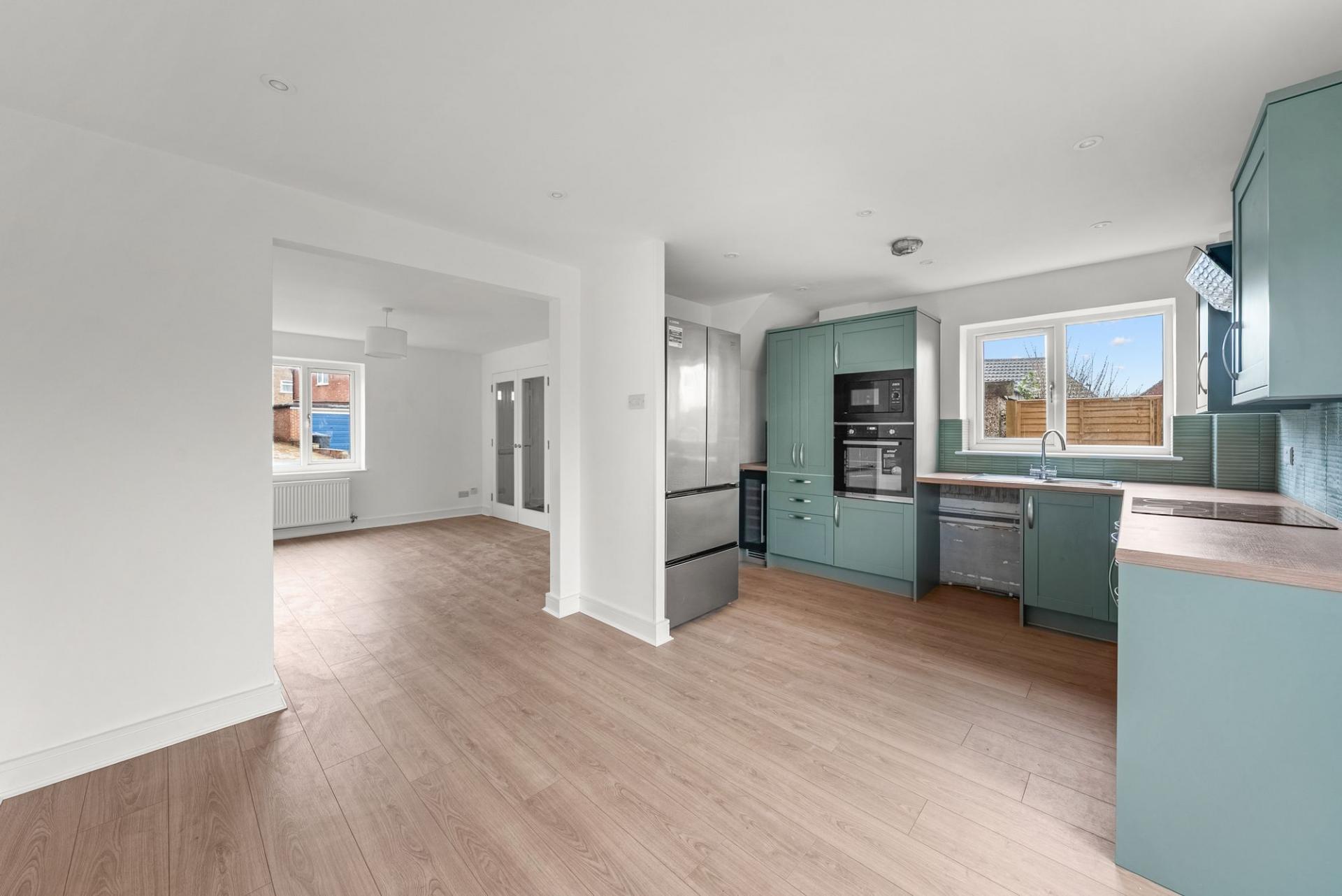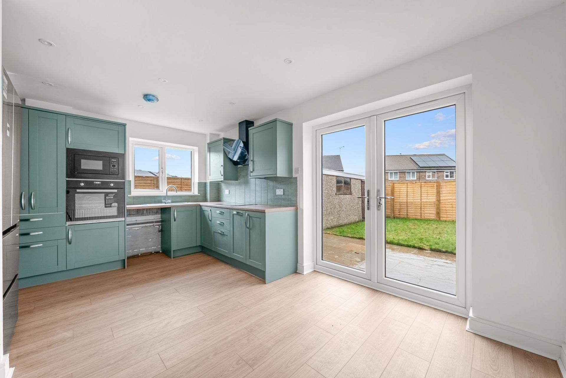 The stylish dining kitchen forms the heart of the home and is fitted with a range of modern Shaker-style units complemented by contrasting worktops and coordinating tiled splashbacks. Integrated appliances include an oven, microwave, hob with extractor over and dishwasher, with space for additional white goods. A window overlooks the rear garden and French doors open directly onto the patio, creating an ideal setting for indoor-outdoor dining and entertaining. There is ample space for a family dining table, making this a sociable and versatile living area.