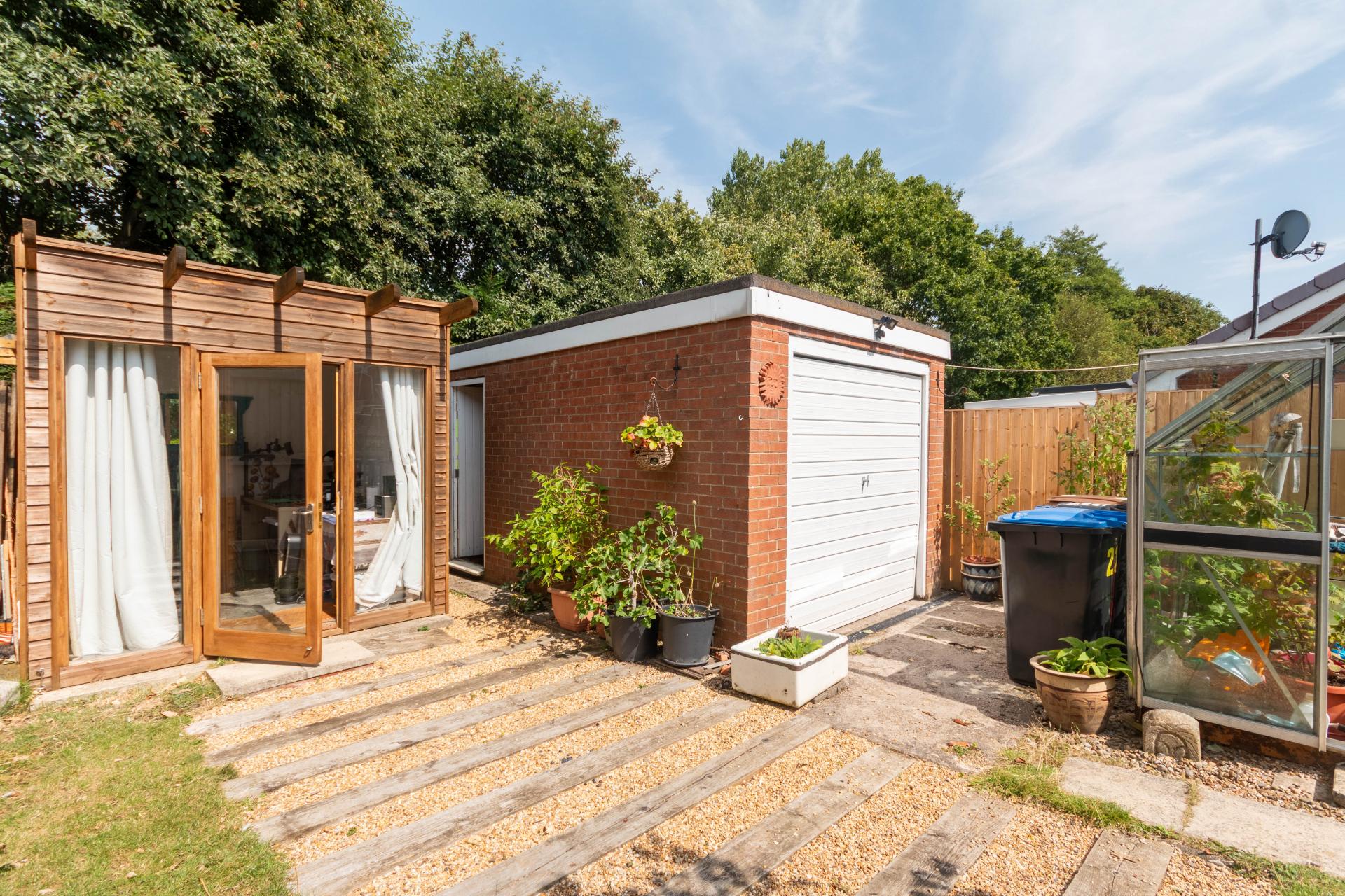 A useful garden office located at the bottom of the garden with light and power, providing an ideal work-from-home space.