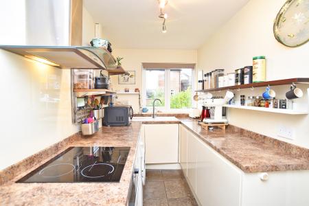 Fitted with a range of modern units with electric induction hob, electric oven, integrated dishwasher, washing machine and space for appliances.