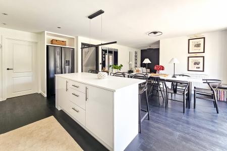 An impressive open-plan living space incorporating sitting, dining and kitchen areas. The kitchen is fitted with modern wall and base units, worktop and island, integrated induction hob, double oven, microwave, dishwasher and stylish downlighting. French doors lead from both the family and dining areas to the rear garden.